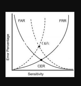 A lower CER or EER means a biometric system has better performance. Replacing a better model is the only way to change EER/CER; altering or even optimizing sensitivity or threshold doesn’t change EER/CER. The following figure shows the crossover error rate (CER) for two biometric systems.