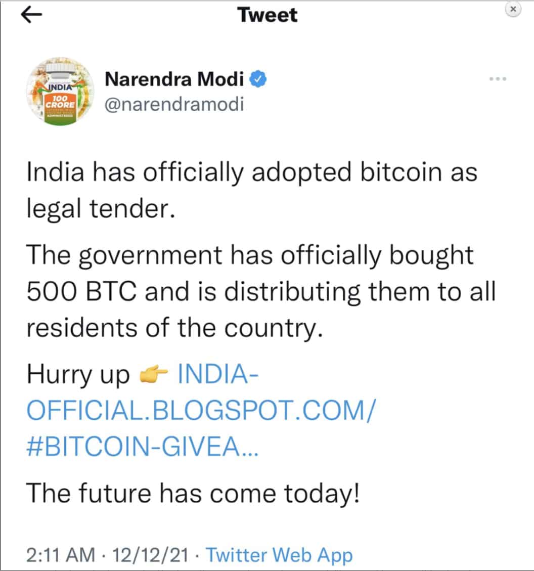A swiftly deleted tweet from his main @narendramodi handle said the Indian government had officially bought 500 bitcoin and was “and distributing them to all residents of the country”, along with a scam link.