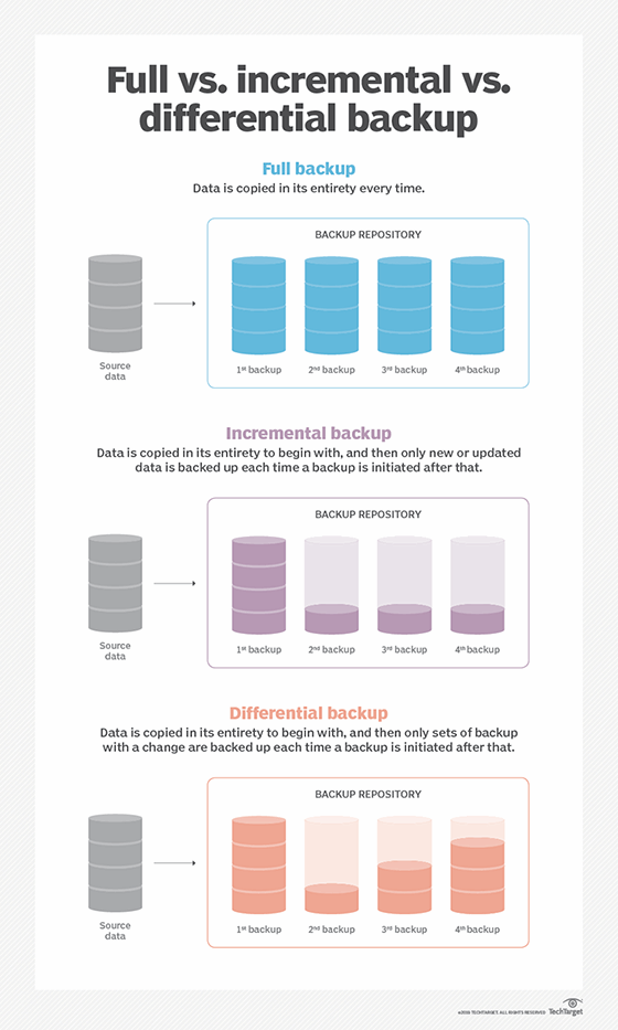 Evaluate full vs. incremental vs. differential backup, as well as newer types of backup, in synthetic and incremental-forever, to determine what’s best for your organization.
