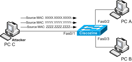 - In this attack, the hacker first connects to the switch ports and floods it’s interface by forcing legitimate MAC addresses out of the MAC address table through very large number of fake MAC addresses .