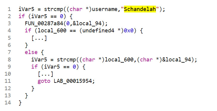 configured to check for a hard-coded username “Schandelah” besides