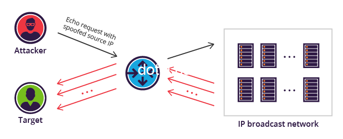 Smurf attack. In a Smurf attack, the attacker floods an ICMP ping to a directed broadcast address, but spoofs the return IP address, which traditionally might be the IP address of a local Web server. When each targeted computer responds to the ping they send their replies to the Web server, causing it to be overwhelmed by local messages. Smurf attacks are easy to block these days by using ingress filters at routers that check to make sure external IP source addresses do not belong to the inside network. If a spoofed packet is detected, it is dropped at the border router. However given that hackers may have subverted 50000 remote hosts and not care about spoofing IP addresses, they can easily be replicated with TCP SYN or UDP flooding attacks aimed at a local Web server.