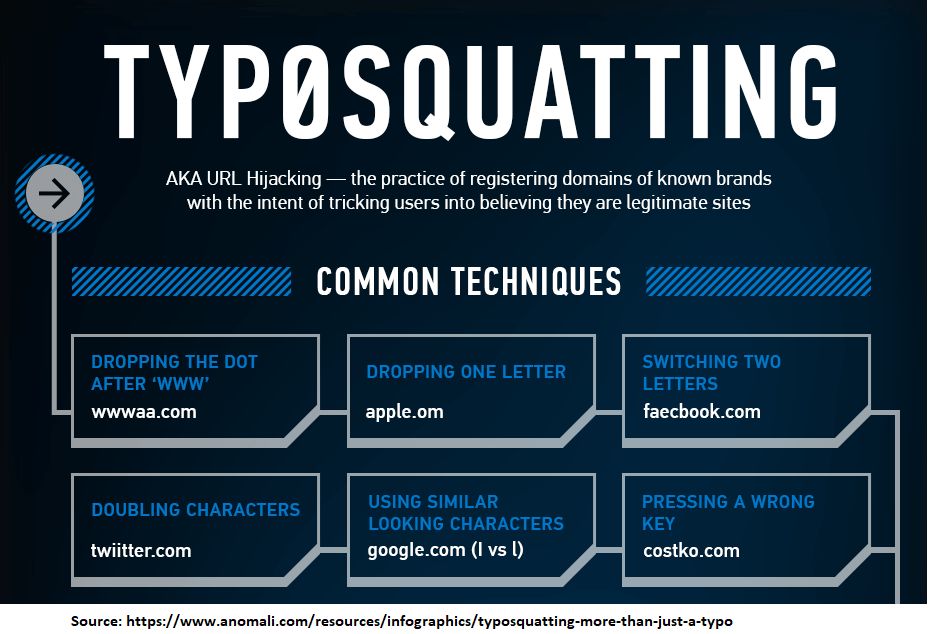To a large extent, typosquatting relies on confusion or simple human error, such as: