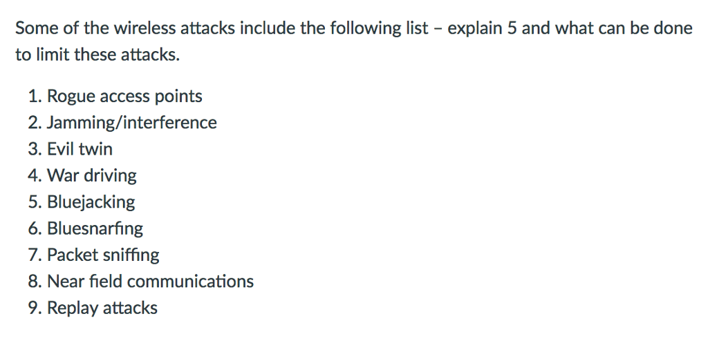 Wireless networks face many network attacks. Some wireless network attacks are listed below.