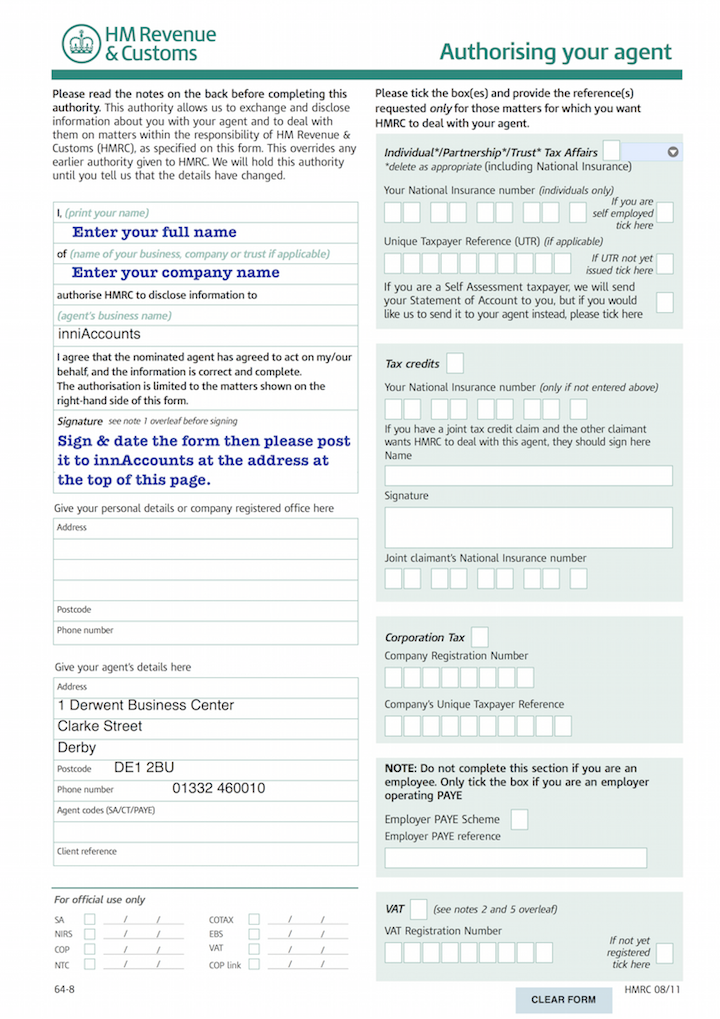 Form 64-8 is a form that allows your accountant to act on your behalf with HMRC as your agent, and to get more information about your tax situation and file your personal tax return.